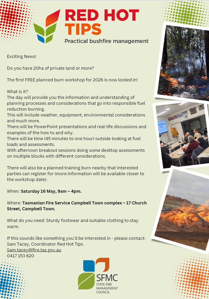 The first FREE Red Hot Tips planned burn workshop for 2026 will be held on Saturday 16 May at the Tasmanian Fire Service Campbell Town Complex.