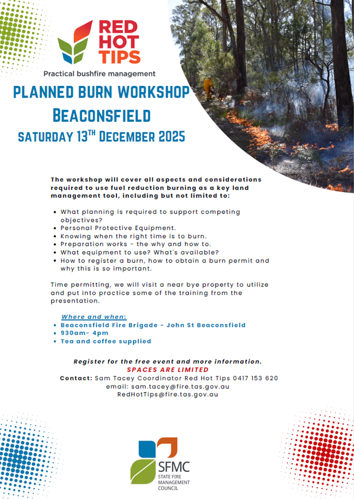 RSVP to Sam Tacey on 0417 153 620 or email sam.tacey@fire.tas.gov.au - SPOTS ARE LIMITED